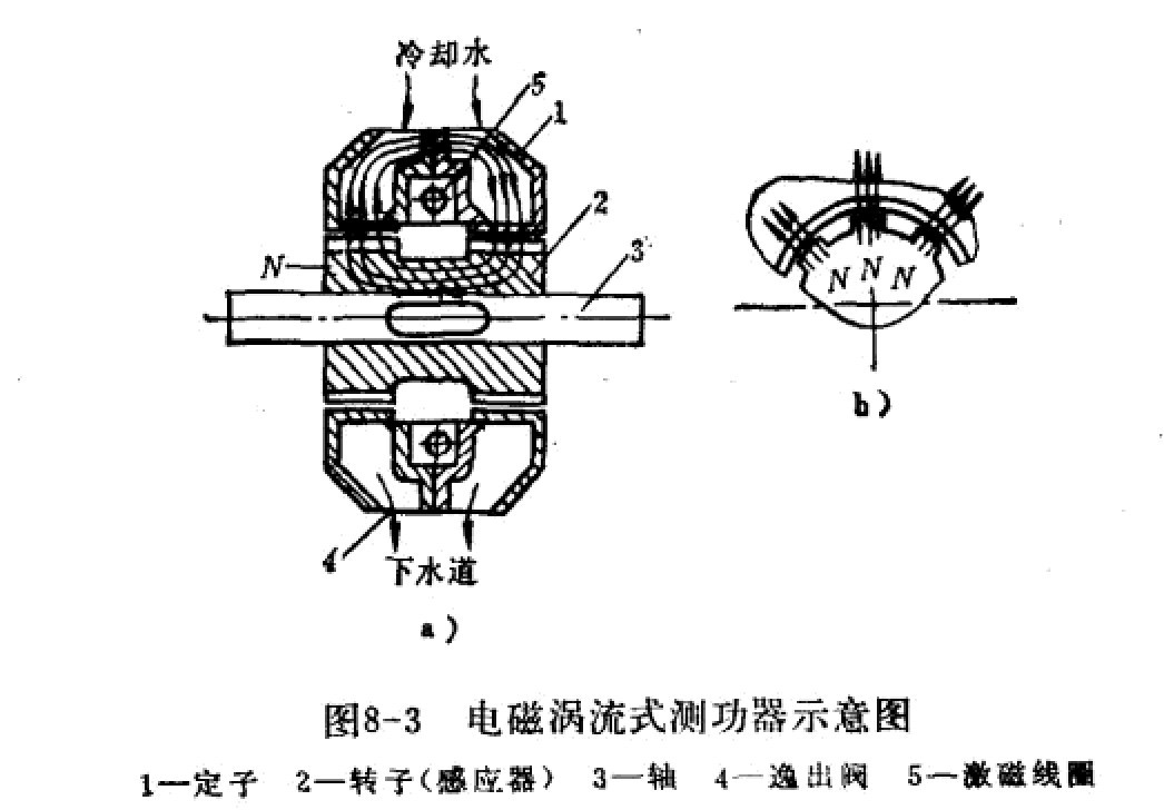 流電動(dòng)機(jī),也可采用其它發(fā)動(dòng)機(jī)。 加載器有機(jī)械的(圖8-2)、水力的(水力測功器)、電力的和電磁渦流的(圖8-3),前三種測功器是常見的,此處不再贊述,下面主要介紹電磁渦流式測功器。