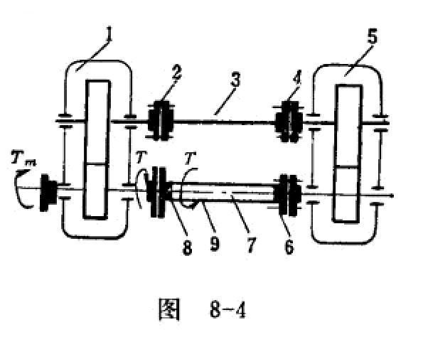 閉式試驗(yàn)臺(tái),是由兩臺(tái)中心距和傳動(dòng)比相同的齒輪箱(見圖8-4中的1和5),用傳動(dòng)軸3,彈性軸7和聯(lián)軸節(jié)2、4、6、8相連結(jié),形成一封閉系統(tǒng)。施加載荷時(shí),松開加載聯(lián)軸節(jié)8的聯(lián)接螺釘,施加外力矩,使彈性軸產(chǎn)生扭轉(zhuǎn)變形,然后鎖緊聯(lián)軸節(jié)8上的聯(lián)接螺釘,也就是鎖住了彈性軸7的扭轉(zhuǎn)變形。在這·個(gè)封閉系統(tǒng)內(nèi),由彈性軸變形而產(chǎn)生的封閉載荷,它只能使嚙合輪齒之間產(chǎn)生一定的嚙合力而并不帶動(dòng)它們運(yùn)轉(zhuǎn)。換句話說,加載機(jī)構(gòu)只是把力施加于系統(tǒng)之內(nèi),但并未對(duì)系統(tǒng)做功。當(dāng)試驗(yàn)臺(tái)運(yùn)轉(zhuǎn)時(shí),電動(dòng)機(jī)輸出的功率比開式試驗(yàn)臺(tái)小得多,僅需用來克服試驗(yàn)臺(tái)整個(gè)系統(tǒng)的內(nèi)摩擦損耗,這些損耗包括嚙合損耗、攪油損耗、軸承損耗、聯(lián)軸節(jié)損耗和彈性軸上的損耗等。不過,后兩項(xiàng)損耗極為微小,可略而不計(jì)。閉式試驗(yàn)臺(tái)驅(qū)動(dòng)電機(jī)的功率,約為封閉系統(tǒng)傳遞功率的4~10%,其數(shù)值與嚙合付的效率、潤滑油粘度和加載器的轉(zhuǎn)動(dòng)慣量等有關(guān),因此,閉式試驗(yàn)臺(tái)所消耗的功率比開式試驗(yàn)臺(tái)節(jié)約得多。下面分析一下閉式試驗(yàn)臺(tái)系統(tǒng)中功率流動(dòng)的情況。