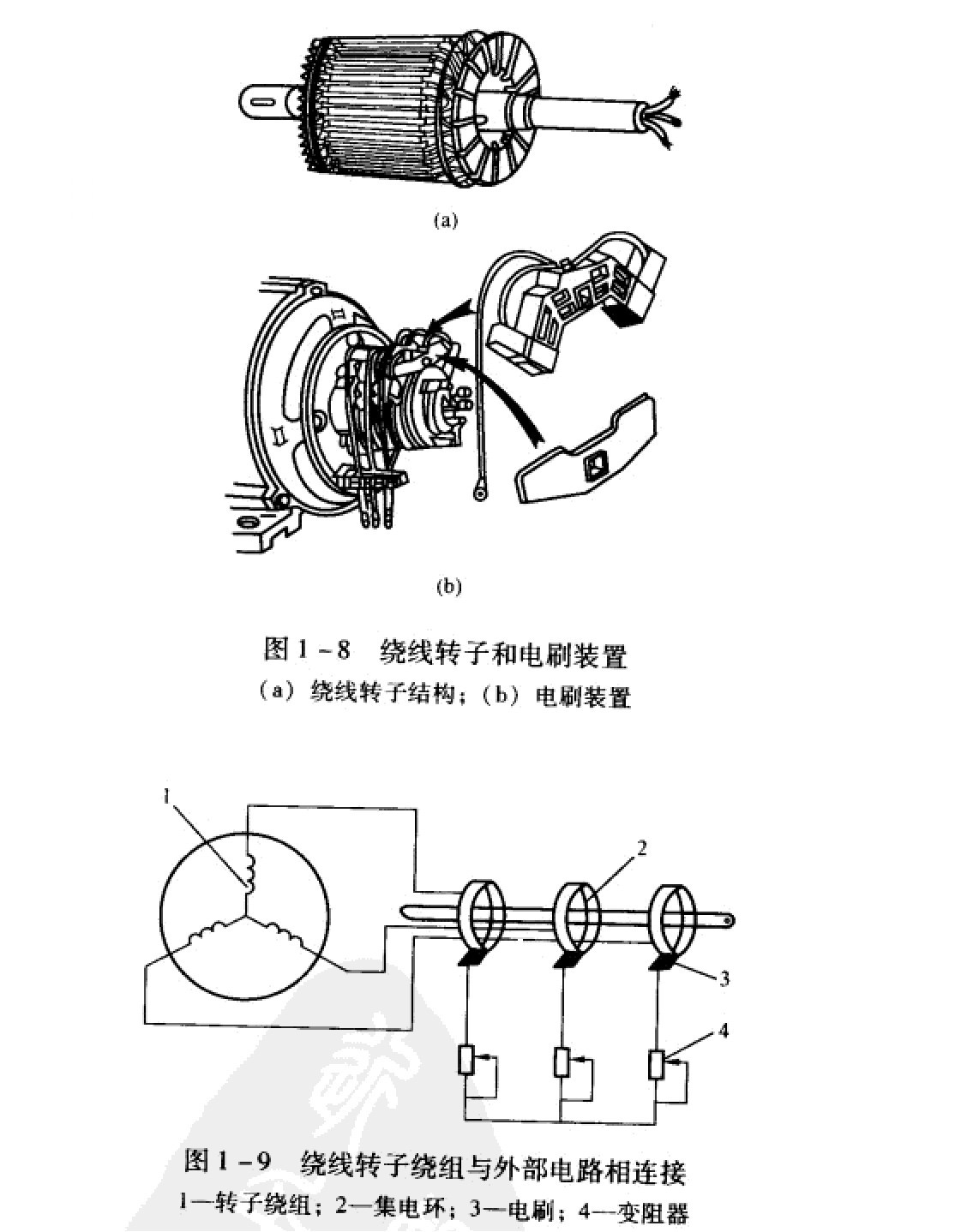 繞線轉(zhuǎn)子是用絕緣導線做成線圈,嵌人轉(zhuǎn)子槽中,再連接成三相繞組,一般都接成星形(丫)。圖I一8所示為繞線轉(zhuǎn)子和電刷裝置。轉(zhuǎn)子的一端裝有3個滑環(huán),稱集電環(huán)。三相繞組的首端引出線分別與3個滑環(huán)相接。梅個滑環(huán)上各有一個電刷,通過電刷將轉(zhuǎn)子繞組與外部電路相連接,如圖1 -9所示,以改善起動性能或調(diào)節(jié)電動機的轉(zhuǎn)速。