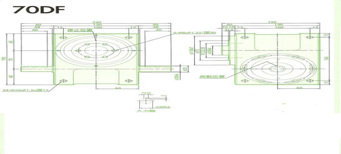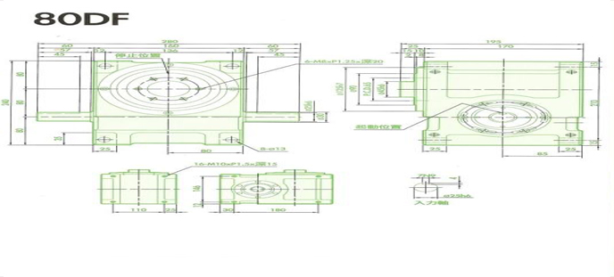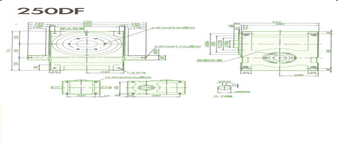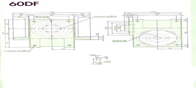 此系列機種之尺寸設計特性與凸緣型弁酮萓A於驅動運轉上可承受超大軸向負載及垂直徑向壓力,在輸出端有一凸起固定盤面及大孔徑空心軸,可搭配設置動態、靜態自動化周邊設備,可將動力源之電、油、氣管路置於空心孔內,此系列機種廣泛應用於重負載、直結自動化設備之各類機構及產業機械,作同步自動化間歇驅動。技術參數項目符號單位數值出力軸容陵|向負荷C1kgf520出力軸容雀b向負荷C2kgf220出力軸容酗O矩Tskgf-m參考力矩表入力軸容陵|向負荷C3kgf220入力軸最大彎曲力矩C4kgf160入力軸最大扭矩C5kgf-m 9.5入力軸的GD2(注1)C6kgf-m20.03定位分割精度sec.30重量kg20注1:入力軸的GD2是在停留範圍內的數值。注2:C1至C5數值是達到安全系數=2時的數值。