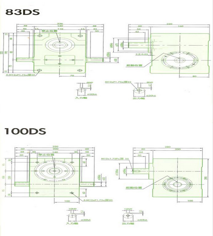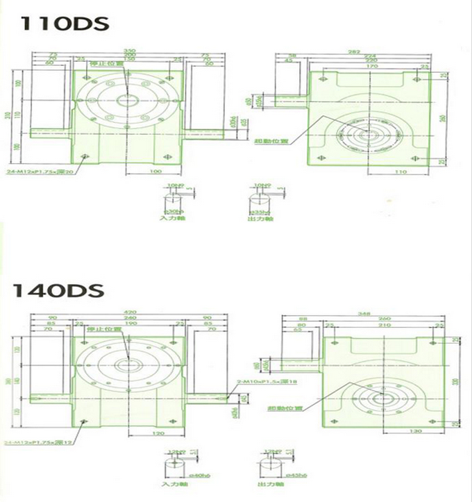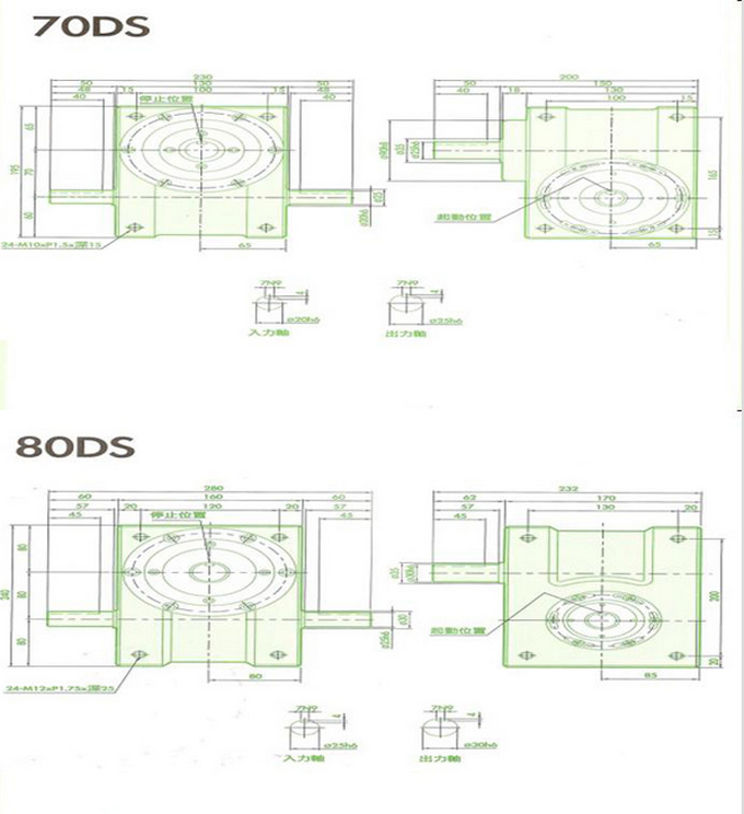 心軸型凸輪間歇分割器:此系列機種為典型傳統心軸造型,其安裝配件之加工安裝配合齒輪、聯軸或聯軸盤,需特別注意孔徑公差(+0.015/-0)及鍵槽公差(+0.015/-0),其使用場合在輸送帶驅動、齒輪驅動、無間隙聯軸器結合驅動居多。 心軸型凸輪間歇分割器的規格型號有:心軸型45DS,心軸型60DS,心軸型70DS,心軸型80DS,心軸型83DS心軸型, 100DS,心軸型110DS心軸型,125DS心軸型,140DS心軸型150DS,心軸型180DS,心軸型200DS