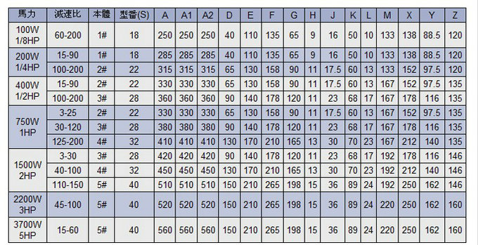 二代立式(標準/縮框)三相剎車馬達減速機詳細參數: