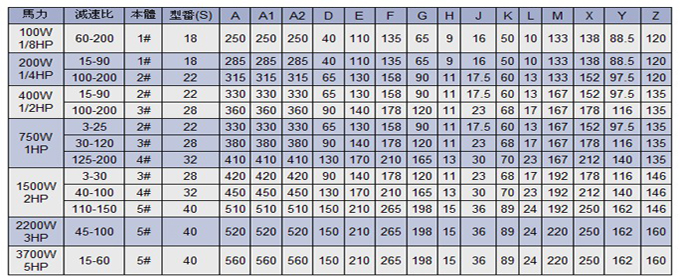 下圖為城邦二代三相齒輪減速馬達的詳細參數(shù):